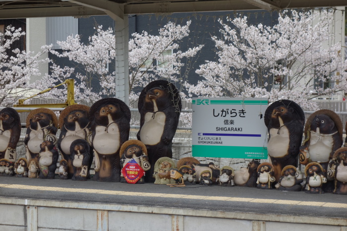 | 統制のとれた整列姿は なんとすばらしい 桜も満開で一層際立つ タヌキさんたち |