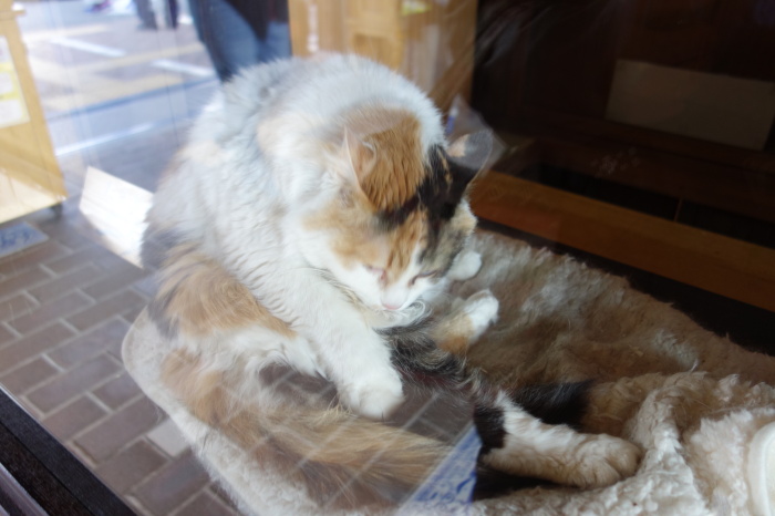 | このネコが駅長です タマ二世でニタマと呼ぶ 三毛猫です ガラスケースの中にいて 普段は外に出ていない |