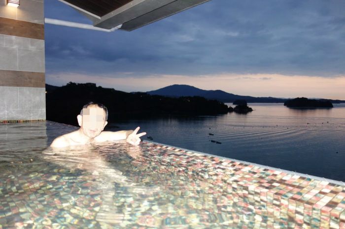 露天風呂から見る 夕景の天草の島々 ロケーション最高 |