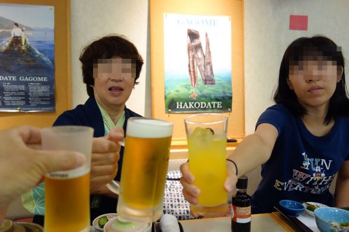 部屋でまったりしてひと寝入りしてたら夕食の時間でした まずは乾杯です 2日ぶりの一杯です |