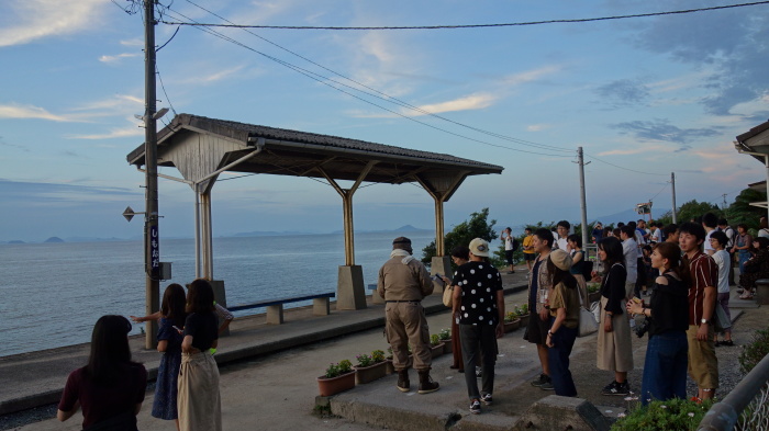 | 列車に乗る人ではなく 夕陽を見に来ている人たちです |