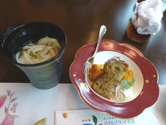 | 稲庭うどん アップルパイ、バナナケーキのデザート |