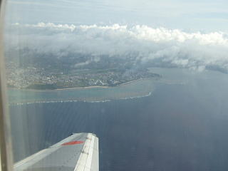 機内アナウンスで宮古島上空とのこと 沖縄本島を通過すると雲も少なく夏の予感 |
