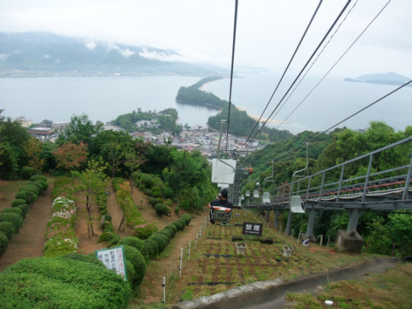 雨の中 天橋立を望める飛龍観へ カッパを着てるのでリフトで行く |