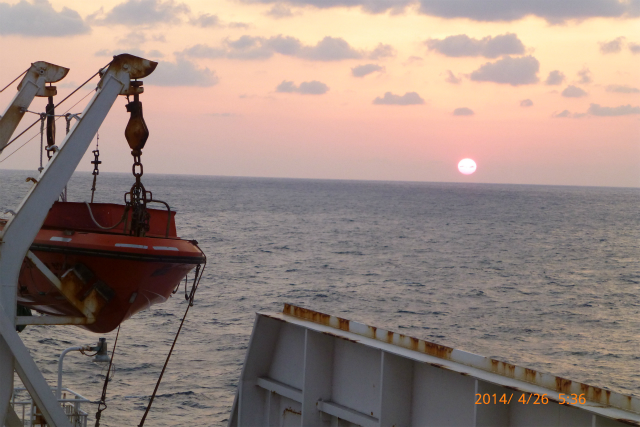 2日目 4月26日 土曜日 船上で迎える朝陽 太陽が登り始める |