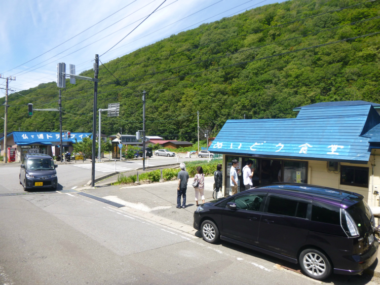 | 下北半島福浦漁港に近い食堂でうに丼、歌舞伎丼が安くてうまいと評判で、全国から 客が訪れている 11時30分に到着したけど、こんなに並んでいる |